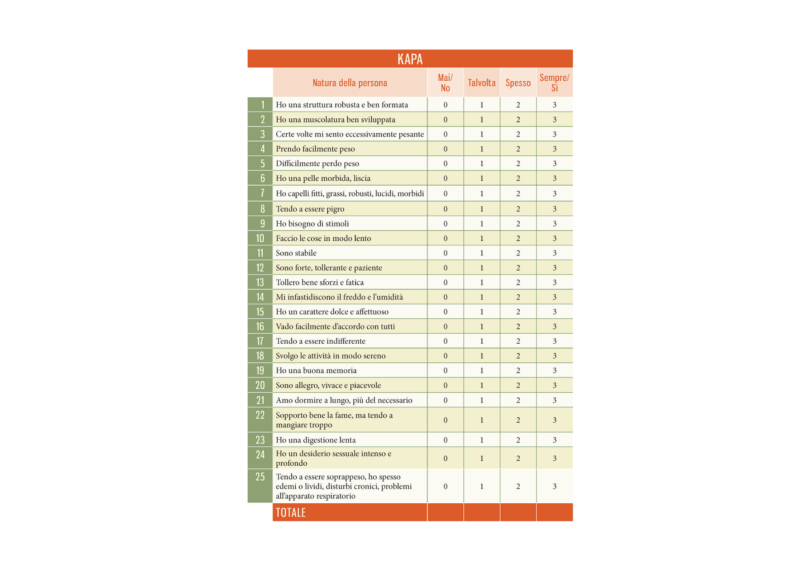 Compilando i test che seguono emergerà il profilo più consono alla nostra costituzione. Inserendo in ciascuna casella il numero corrispondente alla colonna prescelta e facendo, infine, la somma delle cifre di ogni colonna, avremo un risultato che rappresenterà la percentuale presente nella nostra costituzione del Tridosha in questione. Il Dosha che risulta dominante determina la nostra tipologia.